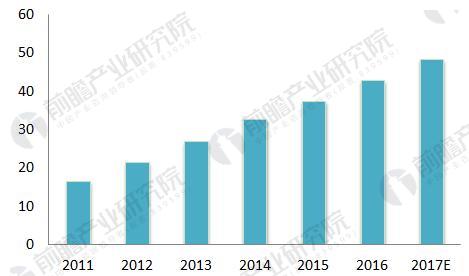 图表3:2011-2017年我国吹填疏浚工程疏浚量(单位:百万立方米)