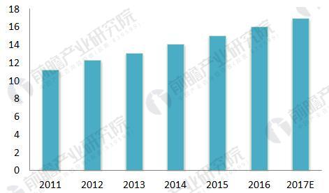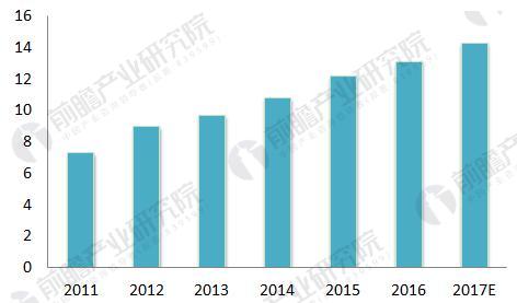 图表1:2011-2017年我国疏浚工程总疏浚量情况(单位:亿立方米)