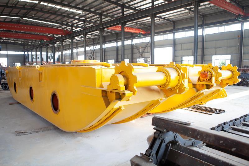 水陆挖掘机属于特种工程机械,适用于各种各样松软土质和水深在1.8米以内的工况(1.8m~3m要加定位桩)。其中,液压式可伸缩设计又属于特殊中的特殊,因为在一些农村区域,需要进行清淤的河道多比较狭窄,而且还会出现宽窄不一样的情况,这个时候液压可伸缩式设计浮箱就可以发挥出很大的作用。而且通过液压油缸缩窄后的浮箱还可以在不拆卸的情况下直接用平板车进行运输,非常方便、经济。