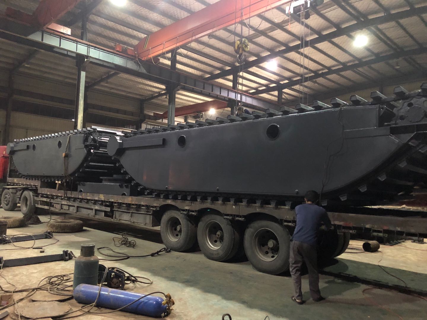 又是一个忙碌的晚上,24日晚九点在我们工人辛苦加班的努力下两台崭新的水陆两用挖掘机浮箱已经装载完毕,即将发货。此次浮箱制作按照伊拉克技术质量要求,特殊定制,伊拉克客户与我司在前期的技术沟通,中期的产品生产,以及产品质量的改进上做出了共同的努力。湖北兴勇机械制造有限公司,专业生产水陆两用挖掘机,我们愿意为您提供最优质的解决方案和服务。