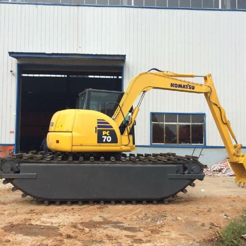 小松PC70搭配水陆挖掘机浮箱专门设计用于在沼泽地区和柔软的地形上机动,它还可以漂浮在水上作为附加的安全保障机械。它完全是自助推进的,几乎可以进入所有地形,但所需的辅助运输和起重设备最少。
